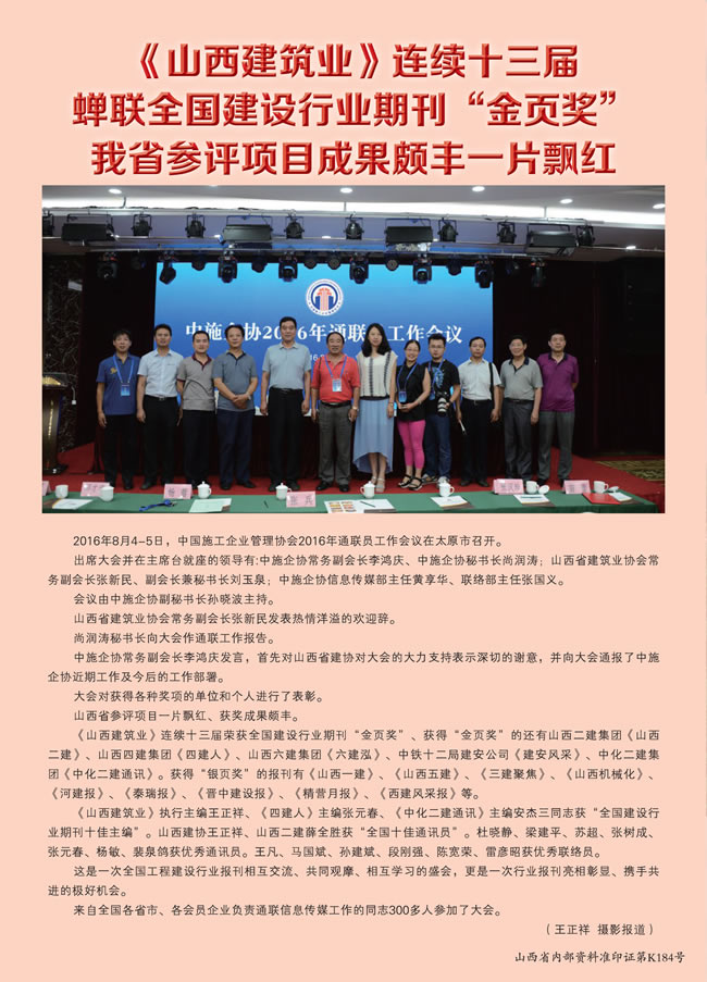 《山西建筑業》連續十三屆蟬聯全國建筑行業期刊“金頁獎”